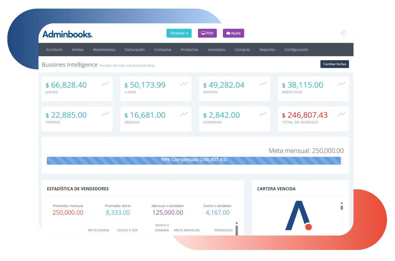 En Adminbooks cuenta con una pantalla resumida en gráficas donde podrás tener una métrica de las ventas de tus colaboradores, aparte de una conciliación visual de ingresos y egresos, lo que permitirá una mejor toma de decisiones.