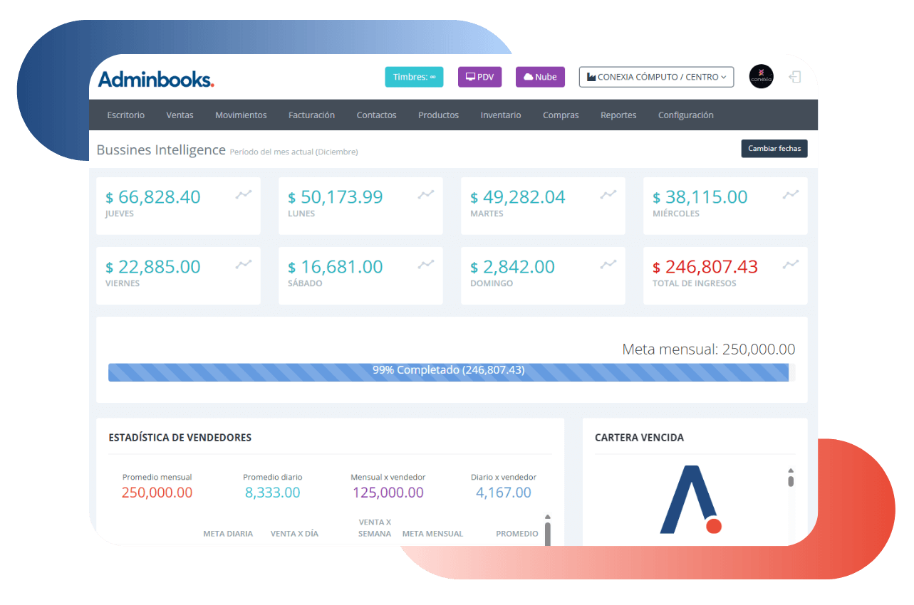 En Adminbooks cuenta con una pantalla resumida en gráficas donde podrás tener una métrica de las ventas de tus colaboradores, aparte de una conciliación visual de ingresos y egresos, lo que permitirá una mejor toma de decisiones.